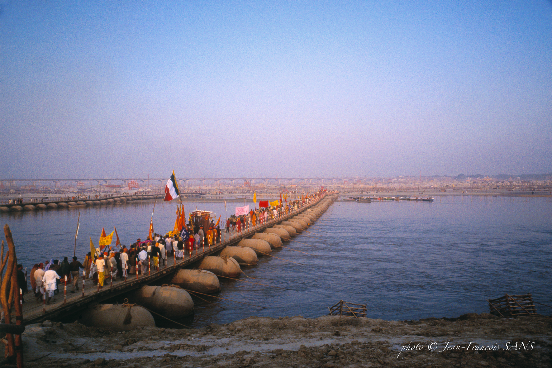 La grande plaine alluvionale recouverte par ces fleuves tout au long de l’année n’est dégagée qu’au mois d’octobre, alors que la Kumbha Mela a lieu en janvier. Dans ce temps très court les autorités organisatrices installent un gigantesque camp de toile pour recevoir les millions de pélerins. Des milliers de kilomètres de lignes électriques sont tirées, des milliers de latrines, des éclairages, l’armée installe des ponts et des routes.